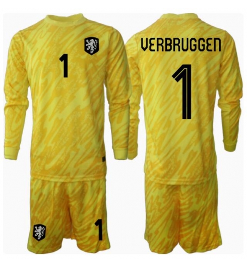 Fotbollsset Barn Nederländerna Bart Verbruggen #1 Målvakt Bortatröja EM 2024 Mini-Kit Långärmad (+ korta byxor)