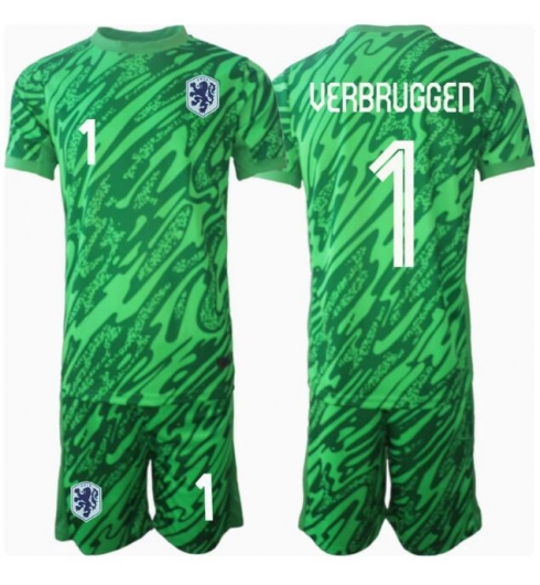 Fotbollsset Barn Nederländerna Bart Verbruggen #1 Målvakt Hemmatröja EM 2024 Mini-Kit Kortärmad (+ korta byxor)